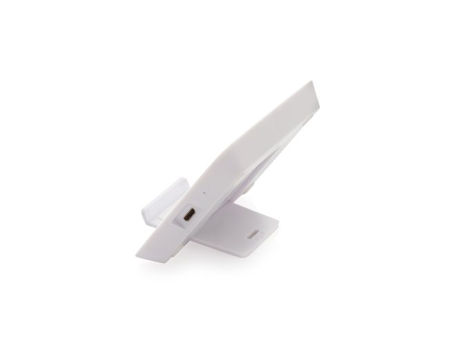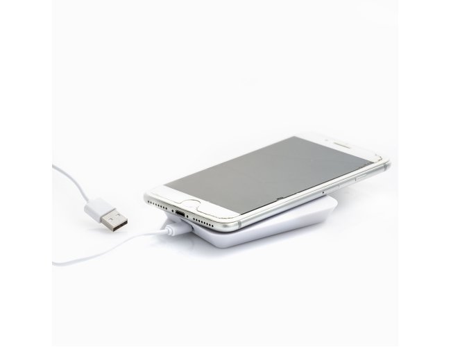 Carregador por indução com suporte para celular, base com borrachas antiderrapantes na área inferior. Acompanha cabo USB. Obs.: O dispositivo não armazena carga (não possui bateria interna), apenas transfere carga quando conectado à uma fonte de energia.