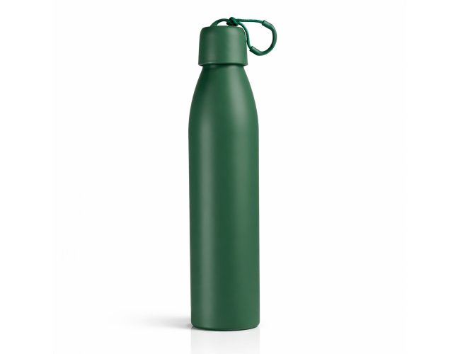 Garrafa térmica de parede dupla, com parte externa em inox 201 e pintura aplicada por spray, e camada interna em inox 304. Com capacidade para até 500ml, conta ainda com tampa rosqueável em polipropileno (PP) e anel de vedação emborrachado, além de alça em nylon com detalhe em plástico.