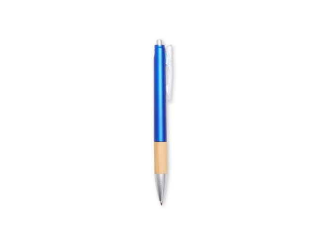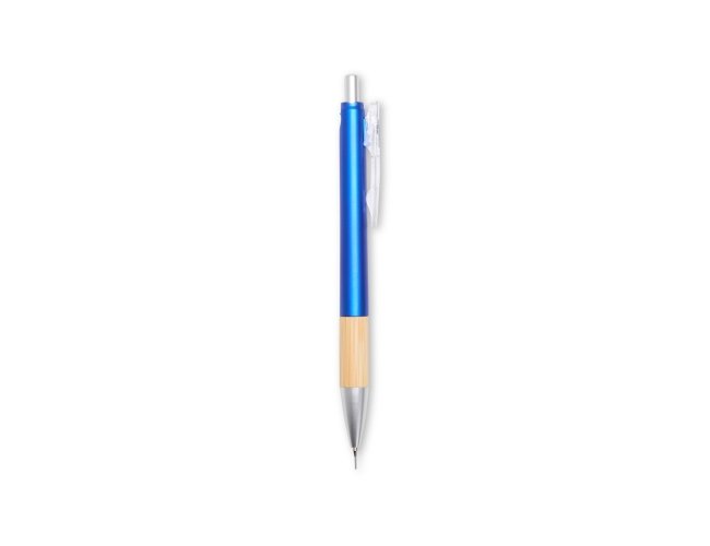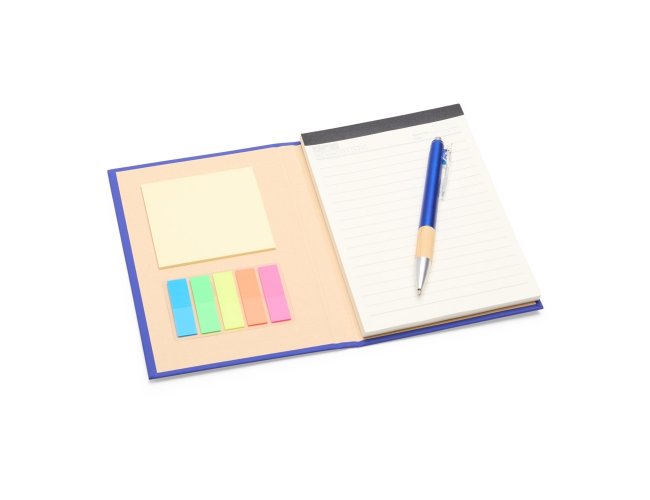 Kit executivo com três peças, composto por uma caderneta, uma caneta e uma lapiseira. A caderneta possui capa dura em papelão reforçado, fechamento em elástico, cerca de 82 folhas pautadas, bloco de folhas amarelas e outro com marcadores autoadesivos coloridos. A caneta e a lapiseira contam com corpo em plástico e detalhes em bambu. Além disso, a caneta possui carga esferográfica azul de 1,0 mm, enquanto a lapiseira dispõe de grafite de 0,7 mm. Acompanha caixa em papelão com berço em plástico para guardar os itens do conjunto.
