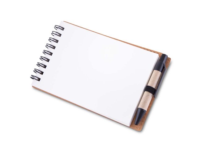 Mini Caderno com capa em papelão e encadernação espiral wire-o, 70 folhas sem pauta em 70g/m². Acompanha caneta confeccionada em papelão reciclado com detalhe em plástico.